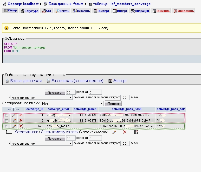 0 asd_cool Опубликовано 22 Июля 2008 Автор Жалоба Поделиться Опубликовано 22 Июля 2008 Народ вообщем я всё сделал почти всё перенёс при помощи запросов )))Выборки нужных полей из таблиц и экспортом.... Есть тока одна проблема.... Есть две таблички:ibf_membersиibf_members_converge В первой хранятся пользователи и их данные всё норм я перенёс и всё стало на места после обновления кеша.... Но есть вопрос такой...я так понимаю в табличке ibf_members_converge хранятся какието данные связанные с паролями....Так вот эта табличка была утеряна к сожалению..... Я придумал как её восстановить.....Но тут есть одно НОСмотрите скрин Вот красным обведены две строки которые были созданы нормальным способом путём регистрации аккаунтов на форумеТретья запись она была восстановлена...Объясню.... из таблицы ibf_membersбыли взяты данные id и mail и вручную добавлены в таблицу при помощи запросаINSERT DELAYED IGNORE INTO `ibf_members_converge` (`converge_id`, `converge_email`) VALUES (673, 'xxxxxxx@mail.ru');затем я зашёл в админ центр и изменил пароль юзерусо следующими метками (смотри скрин) Вот благодаря этому в таблице ibf_members_converge поля converge_pass_hash и converge_pass_salt заполнились нужными данными.... Осталось толко поле converge_joined Видимо без этого правильного заполненного поля никак .... Ибо не войти под лигоном и паролем учетной записи с ID 673 Помогите решить проблему..... PS Ещё такой косяк возник.... Что пользователи как бы есть но не совсем....Тобиш в админки когда смориш просто список то вроде всё норм....А когда начинаешь пользоваться поиском то ничего нельзя найти ни одного пользователя ни по ID не по нику..... Форум видит "полноценно" тока две записи которые были созданы естественным путём... (id 1 и id 2) Цитата Ссылка на комментарий Поделиться на других сайтах Прочее